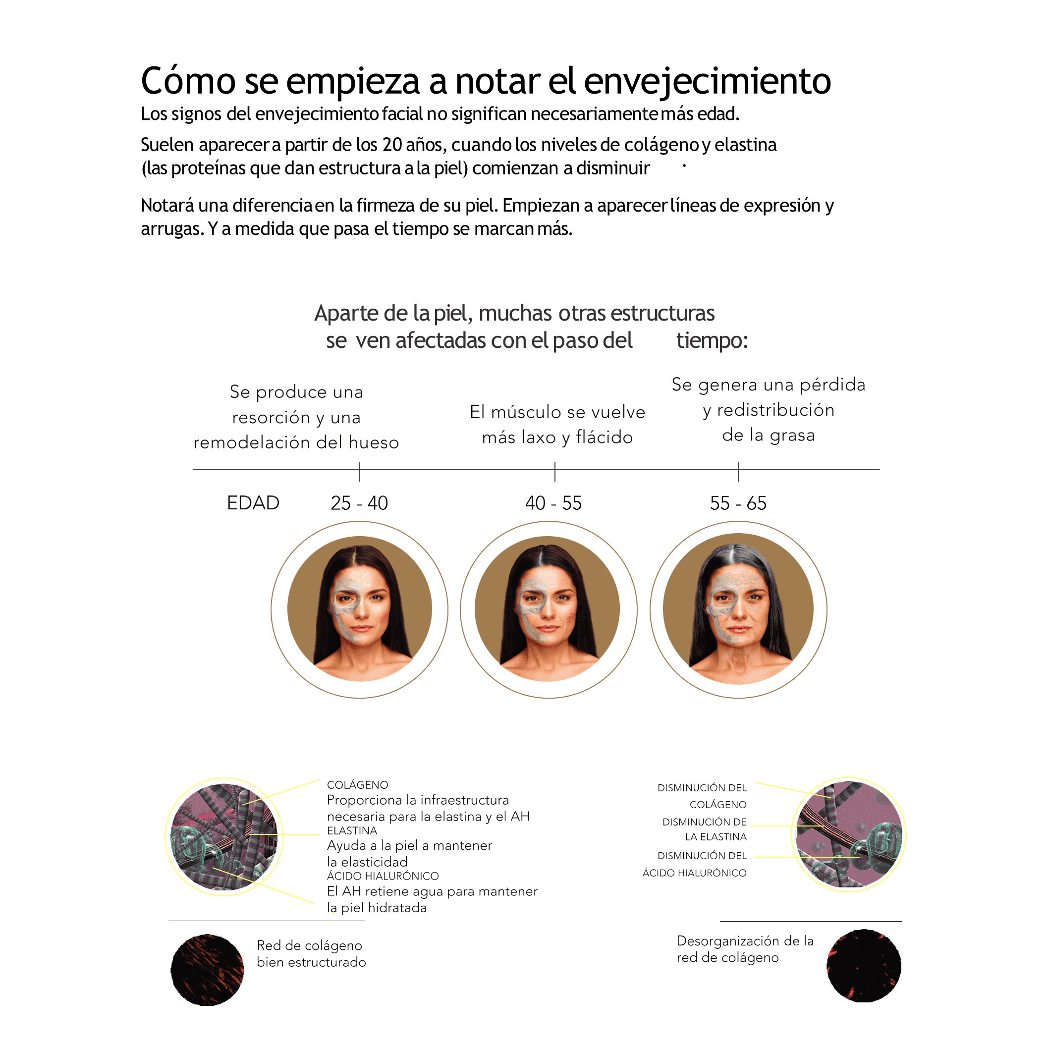 Los signos del envejecimiento facial no necesariamente significan que estás envejeciendo. Suelen empezar a aparecer a partir de los veinte, cuando los niveles de colágeno y elastina (las proteínas que dan estructura a la piel) empiezan a disminuir.