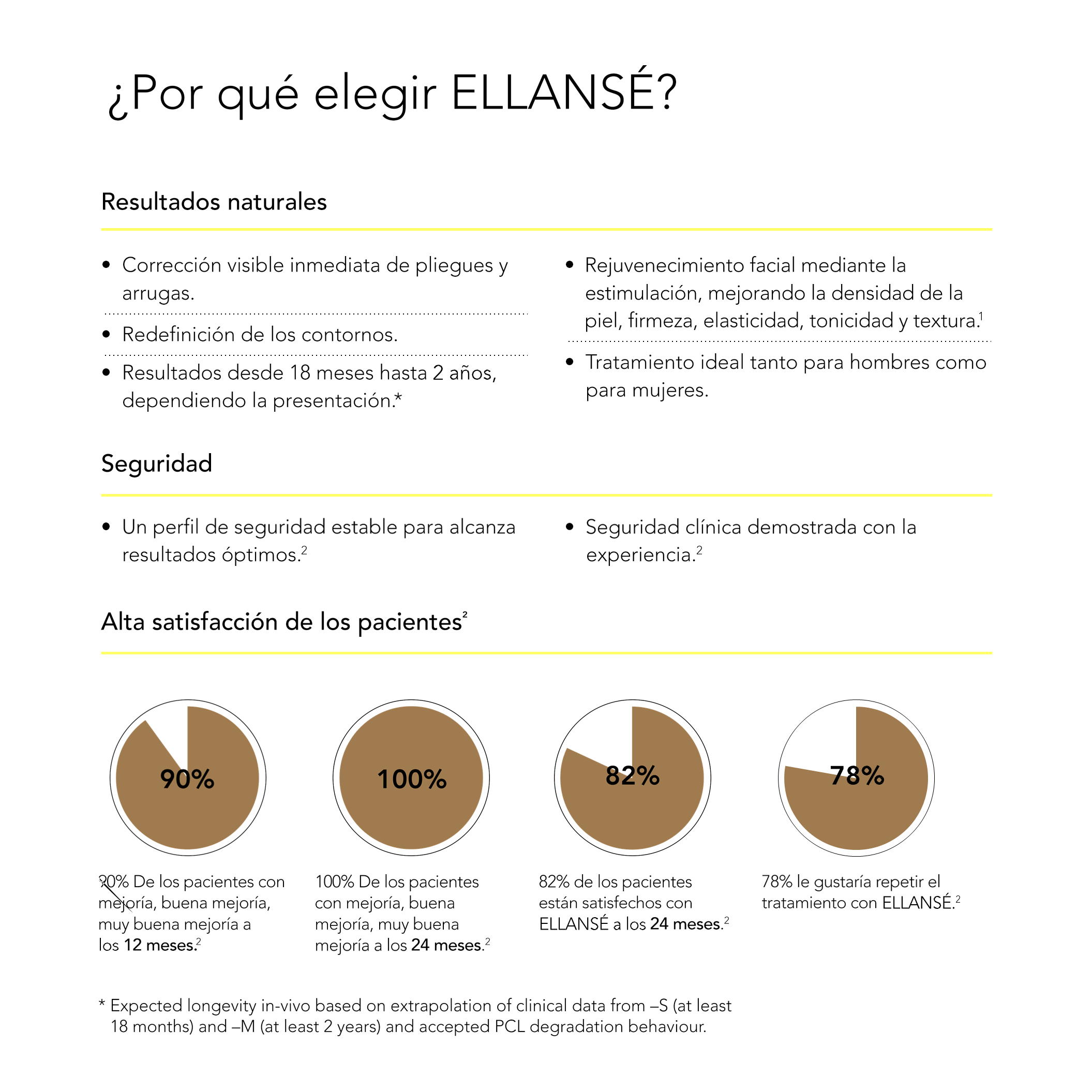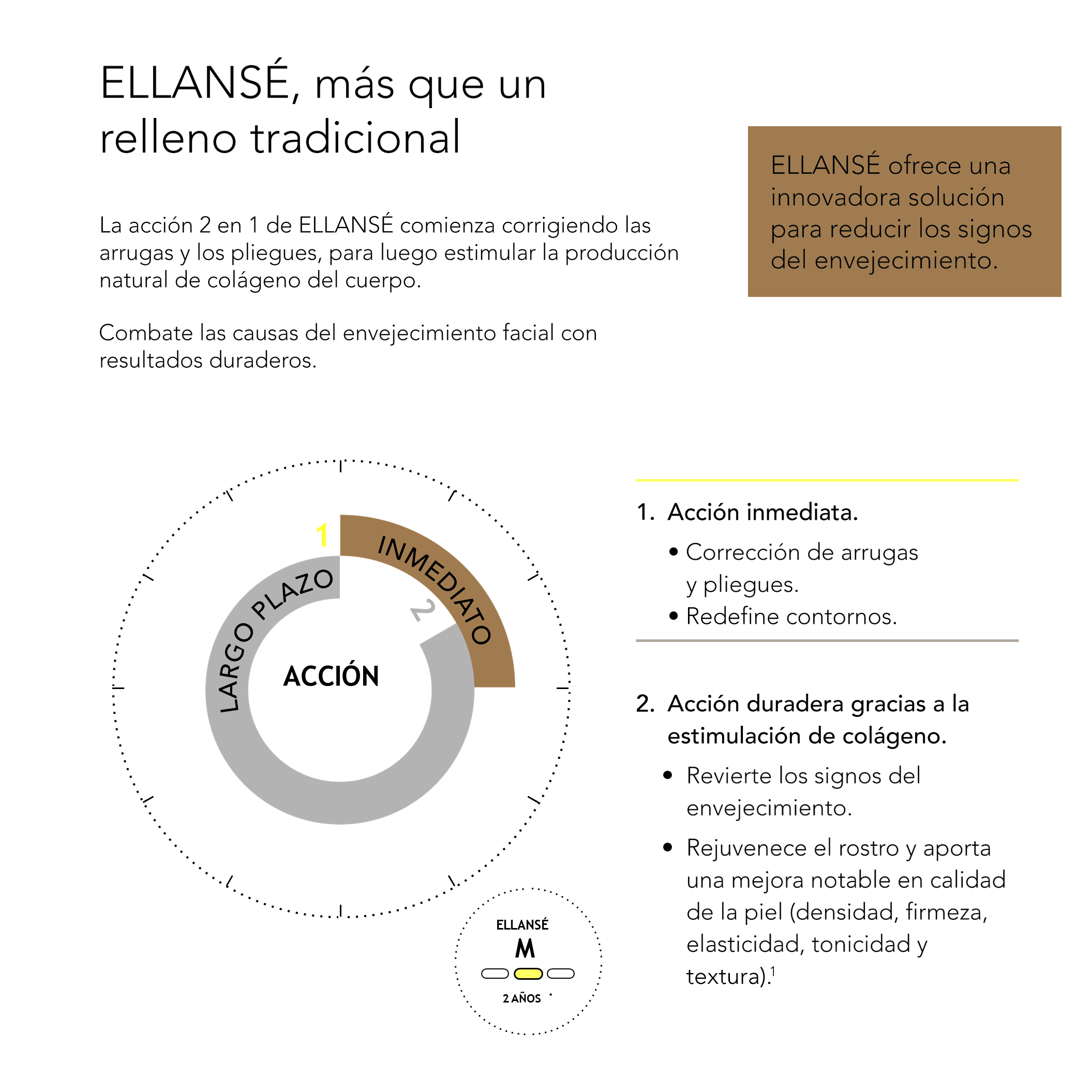 Ellansé es el primero de una nueva clase de rellenos dérmicos que actúa para regenerar naturalmente el volumen y restaurar la forma que el tiempo ha quitado. Gracias a sus propiedades únicas, funciona de forma diferente y natural, no sólo para corregir arrugas y pliegues, sino también para estimular la producción natural de colágeno para tratar realmente las causas subyacentes del envejecimiento facial. Los efectos son graduales y duraderos, brindándole una apariencia juvenil natural.